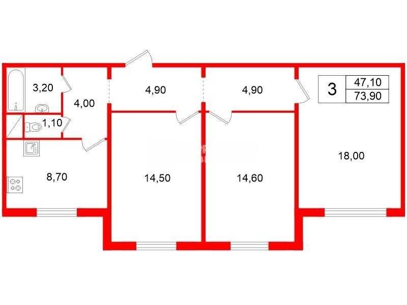 3-комн. кв. 73.9 м² у метро Гражданский Проспект