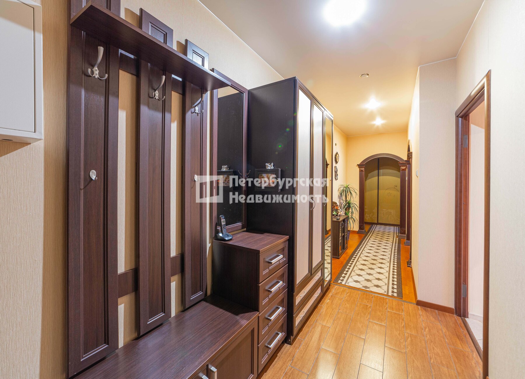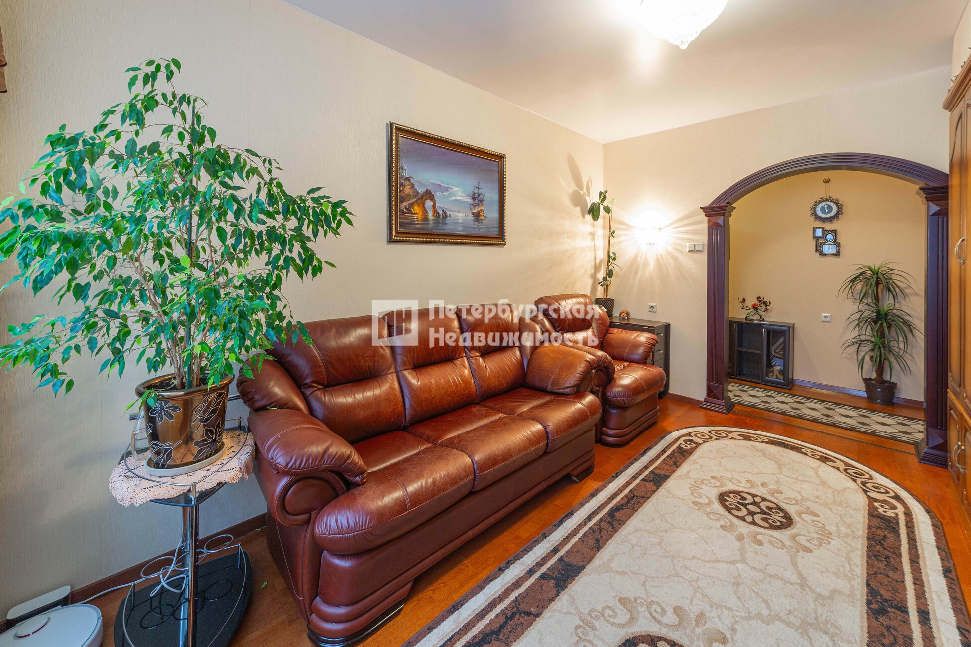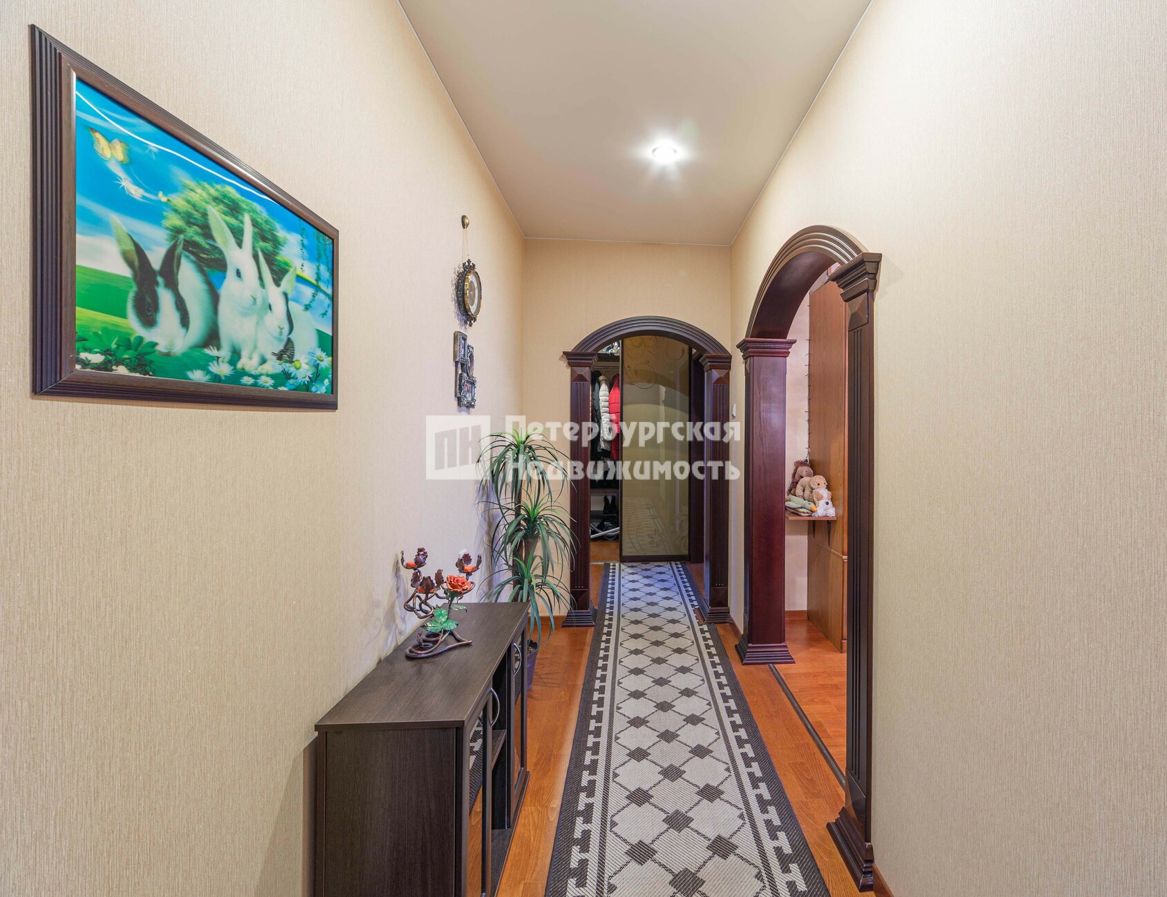 В коридоре и гостиной арки из массива дерева.