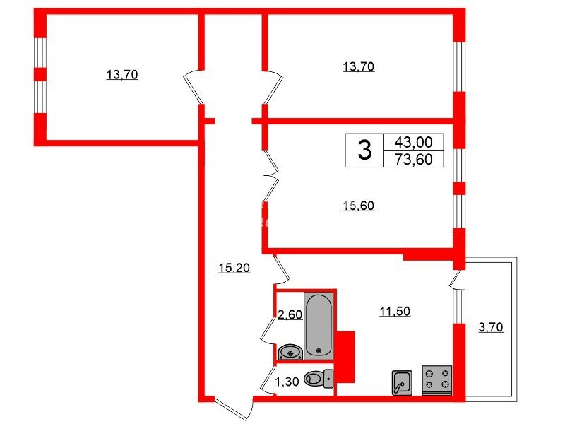 3-комн. кв. 73.6 м² у метро Проспект Ветеранов