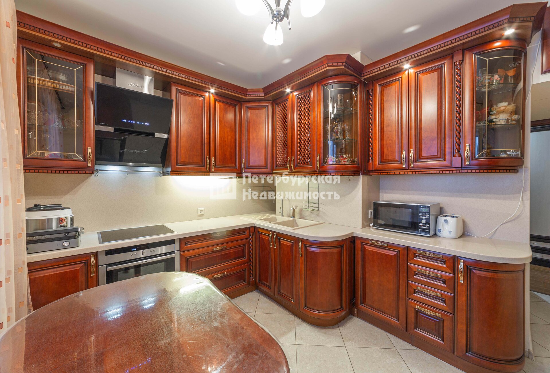 Кухонная мебель из массива дерева, с современной встроенной техникой: