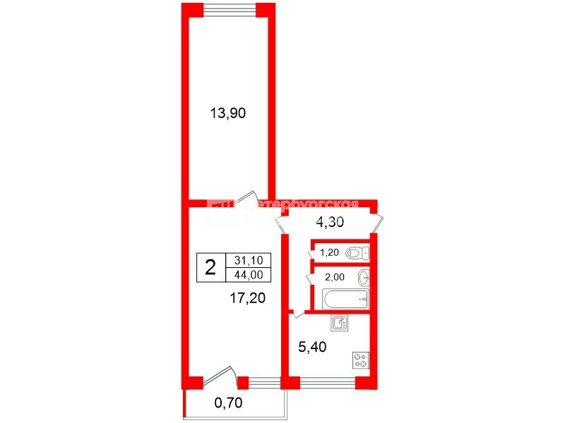 Общая площадь 44.0 м2, комнаты 17.2 м2 и 13.9 м2, кухня 5.4 м2, балкон. Окна на две стороны, солнечная и северная сторона, высота потолков 2,52 .