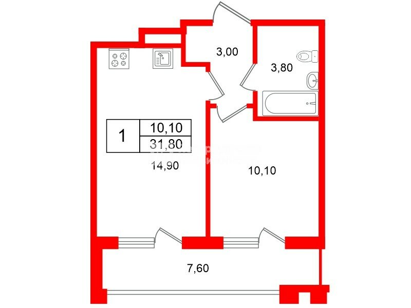 1-комн. кв. 31.8 м² у метро Купчино