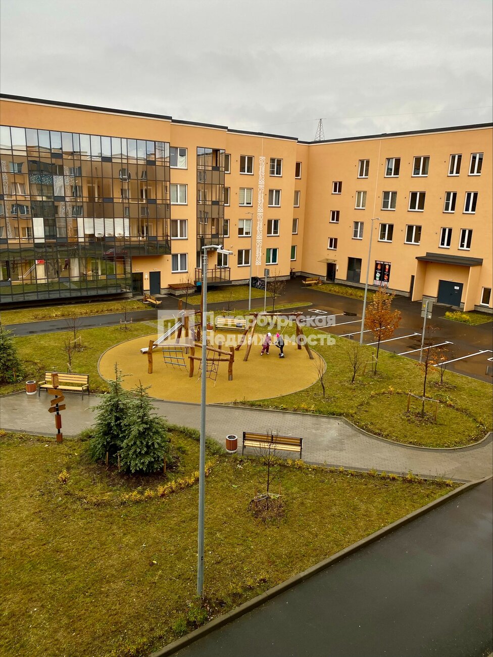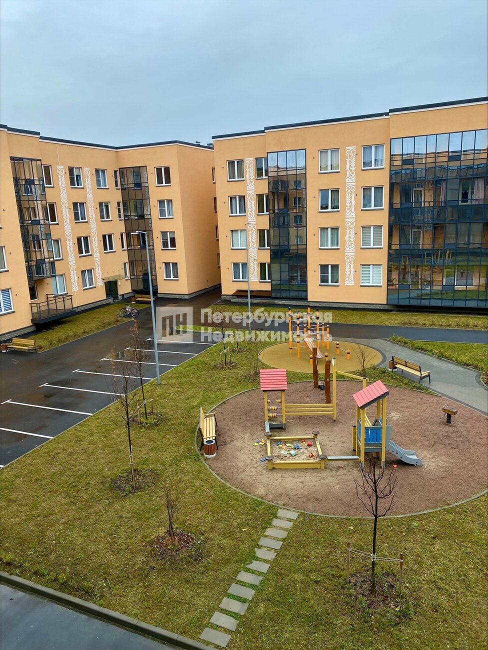 Современная придомовая территория с закрытым двором от посторонних и автомобилей.