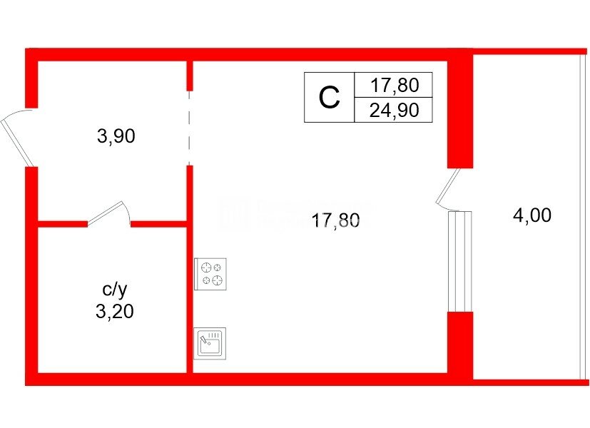 С учетом балкона общая площадь 28,9 кв. м.