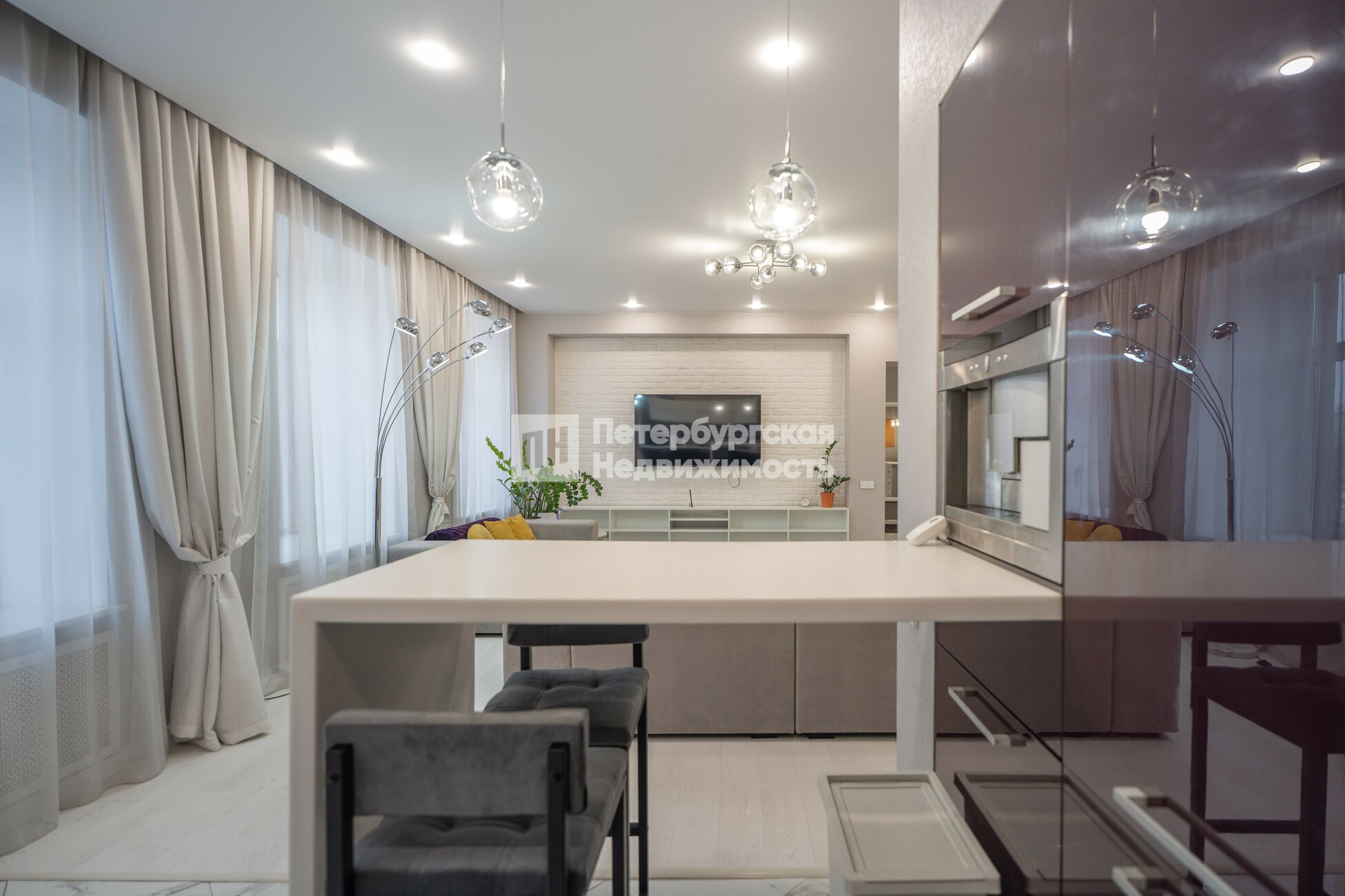 Редкий формат: кухня-гостиная 45 м2, высокие потолки 3 метра, много воздуха и света, ощущение полноценного дома, а не стандартной планировки.