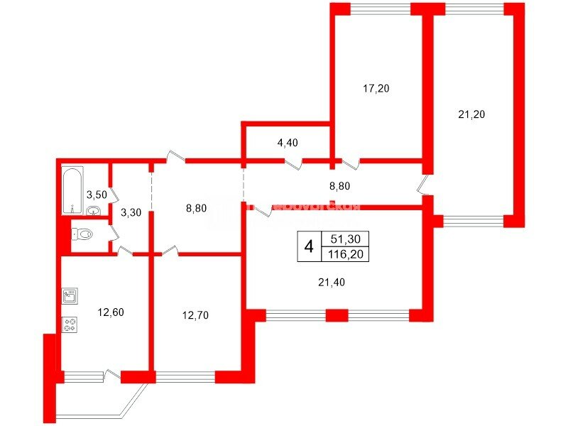 Четвертая комната по характеристикам считается верандой, но фактически дополнительная комната 21м2 с окнами на две стороны.