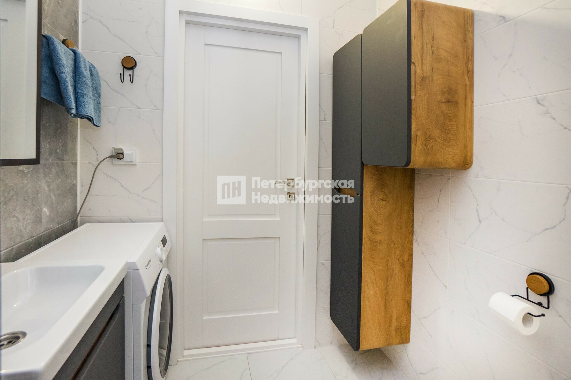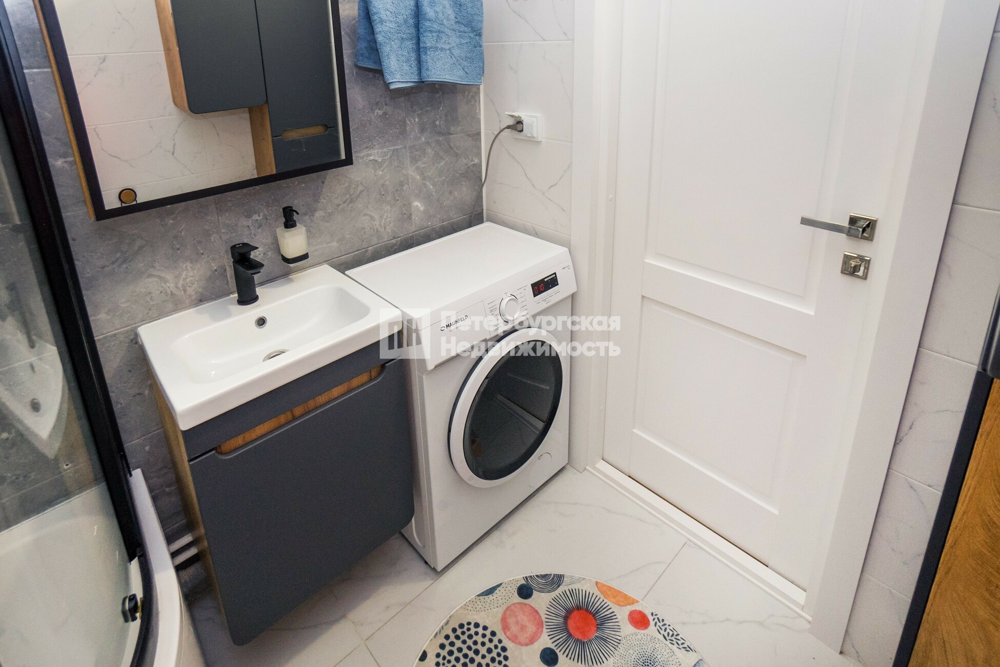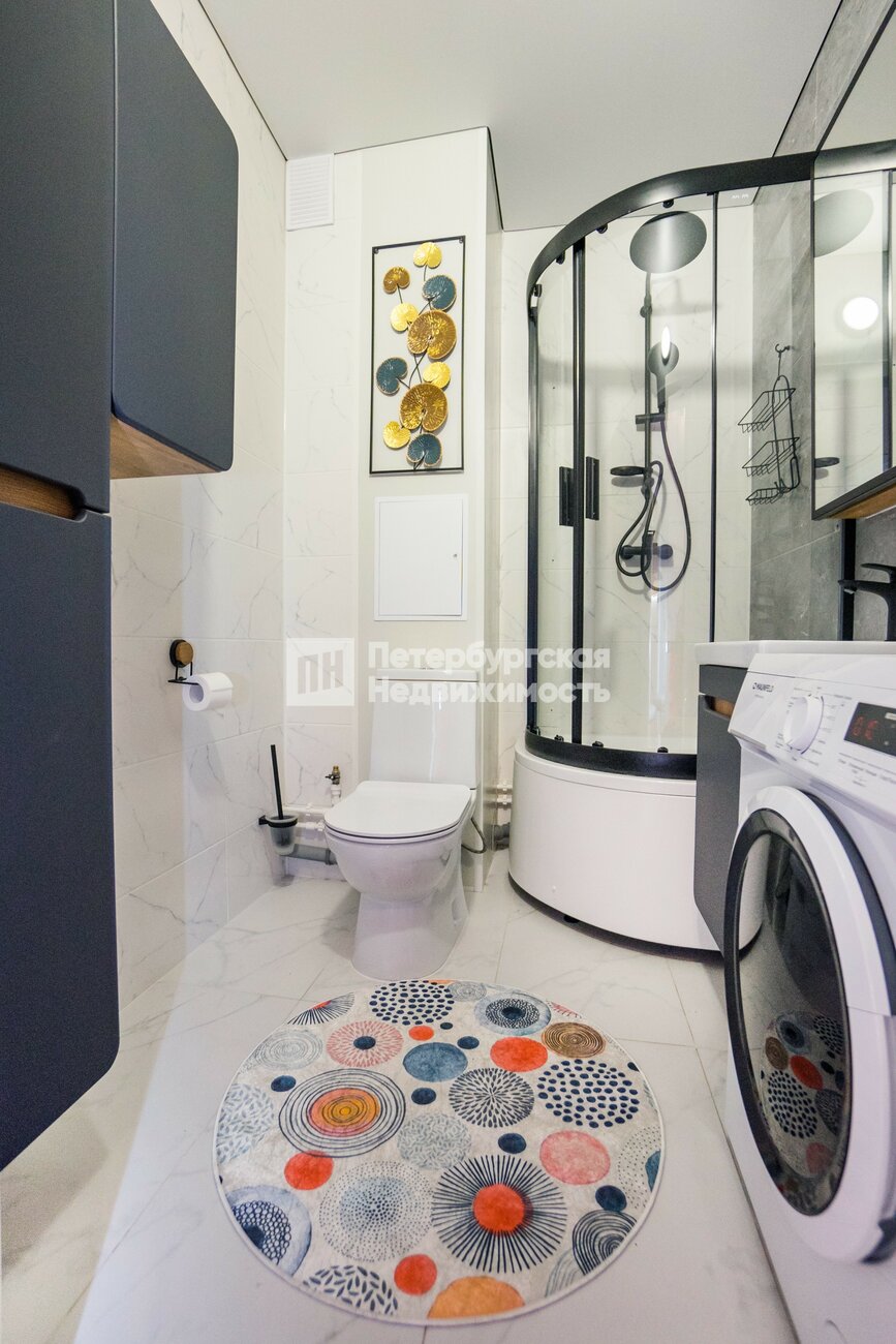 Ванная комната со стиральной машиной и большой душевой кабиной. Полы с подогревом в санузле и коридоре — уют и экономия тепла.