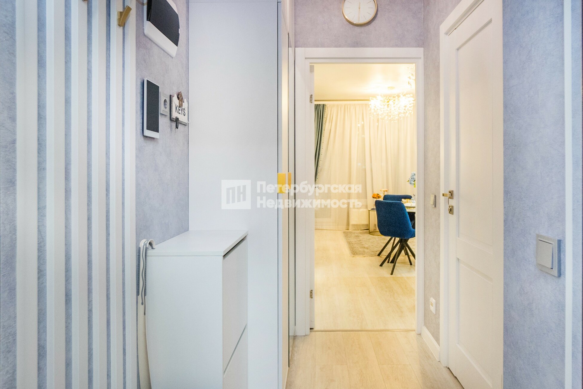 В прихожей видеодомофон с доступом к видеонаблюдению, диспетчерской связи и учётом счетчиков.