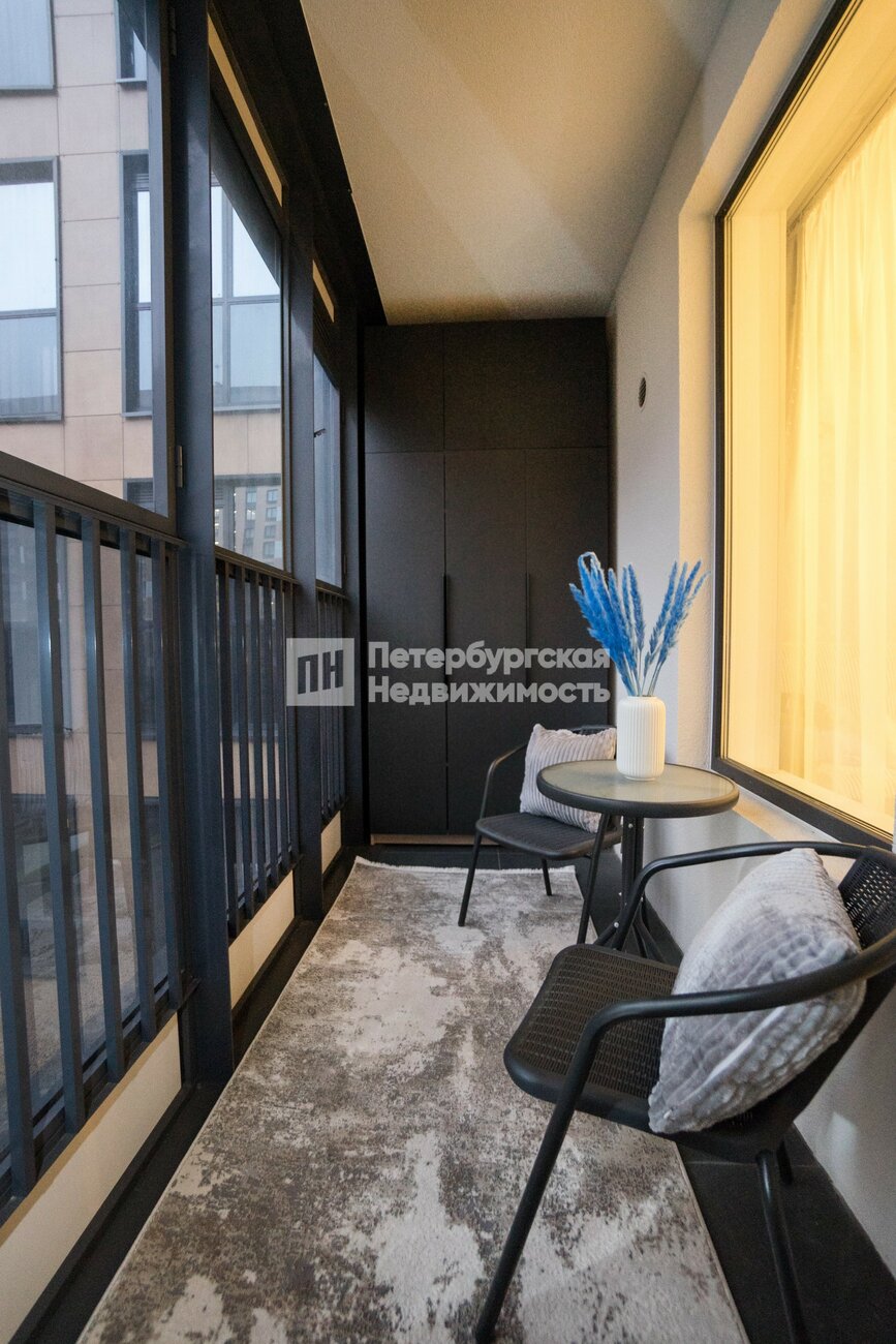 Просторная застекленная лоджия с местом для отдыха и вместительной системой хранения.