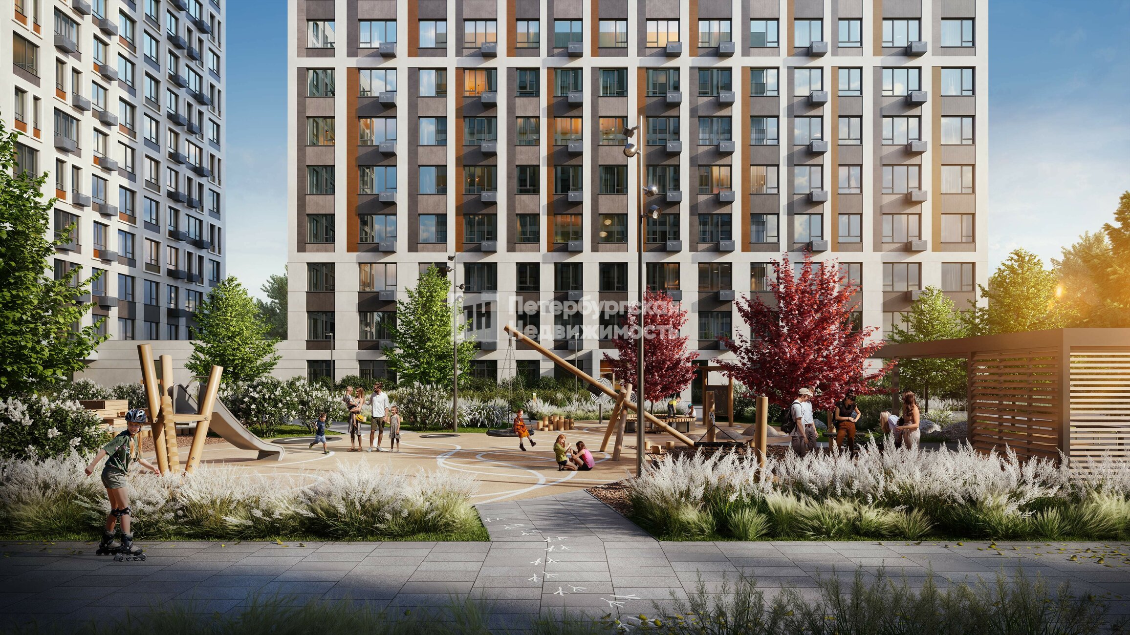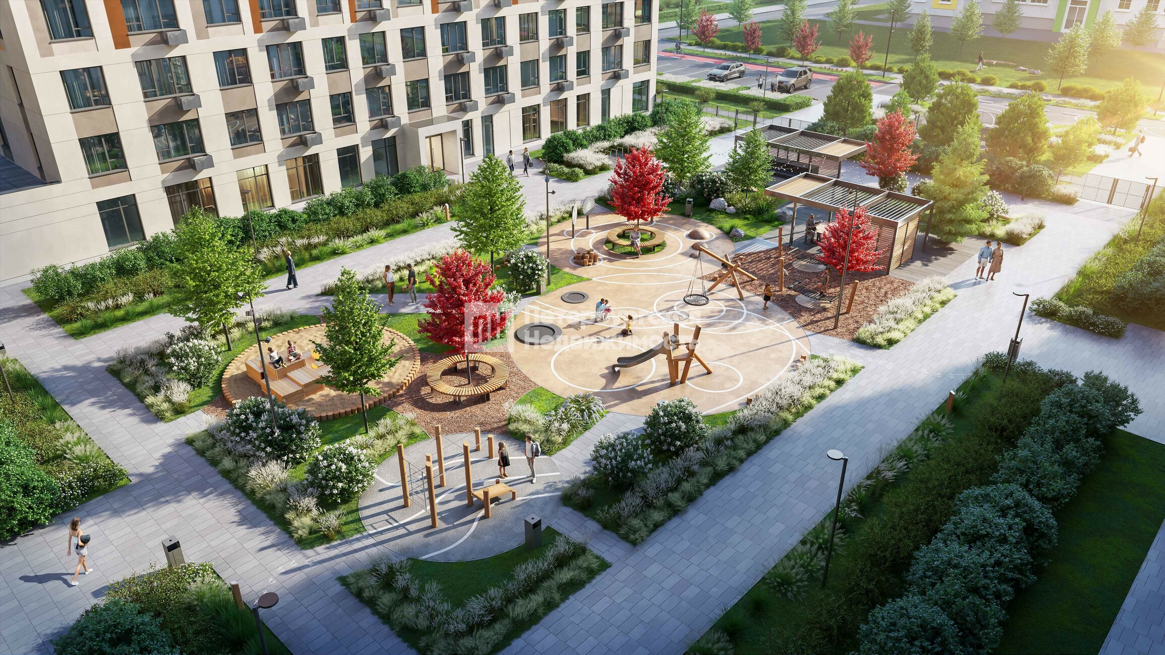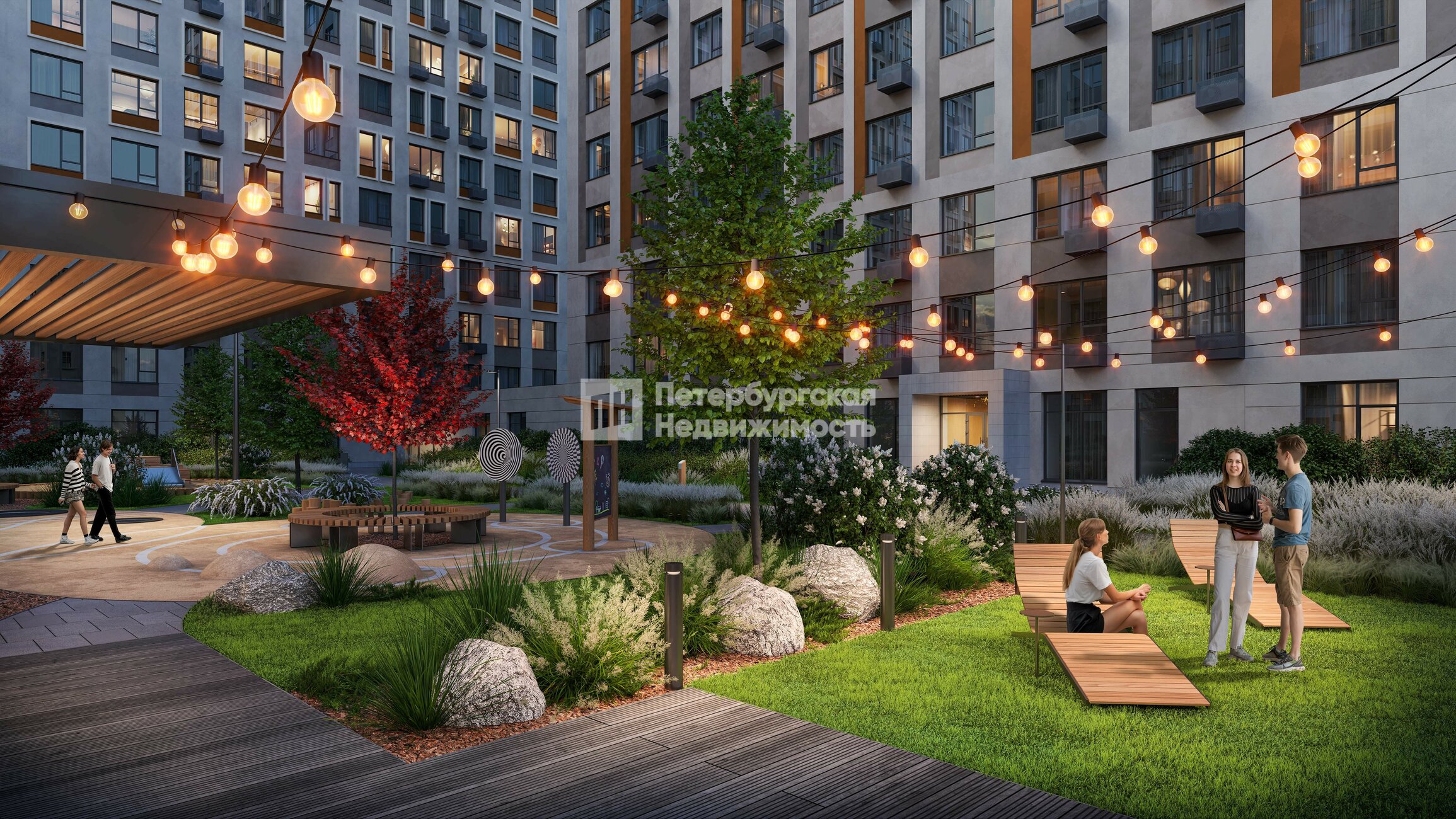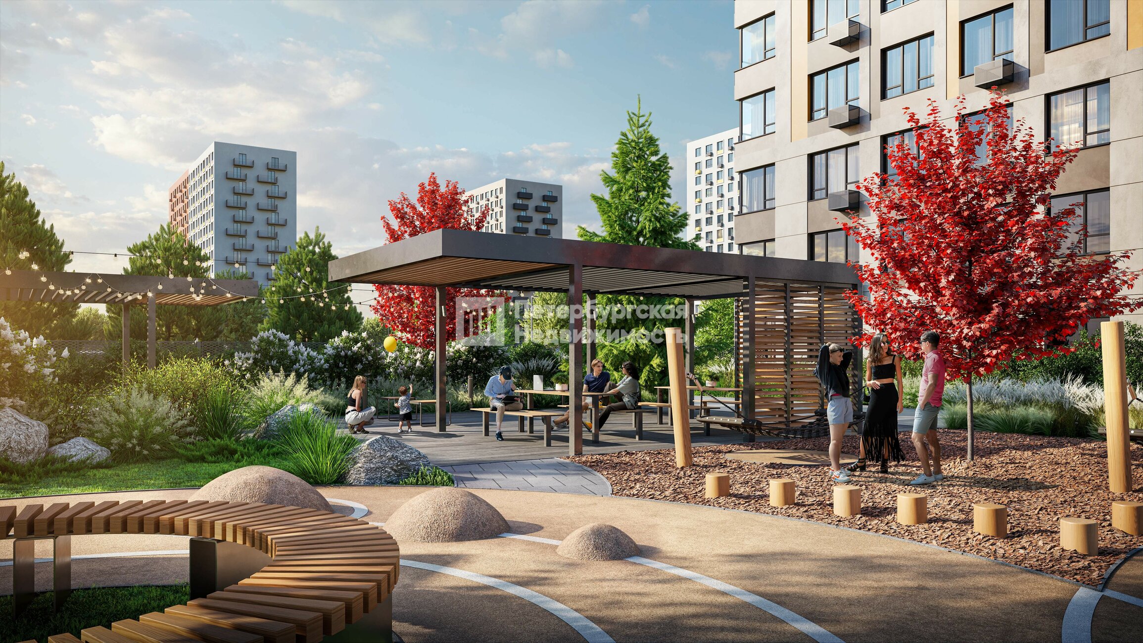 Эко-двор и зоны комфорта: Беседки с розетками для работы и отдыха, Вайфай (WI-FI), шезлонги, гамаки, зеленые зоны, спортплощадки Workout, детские эко-площадки и тихие лаунж-зоны.
