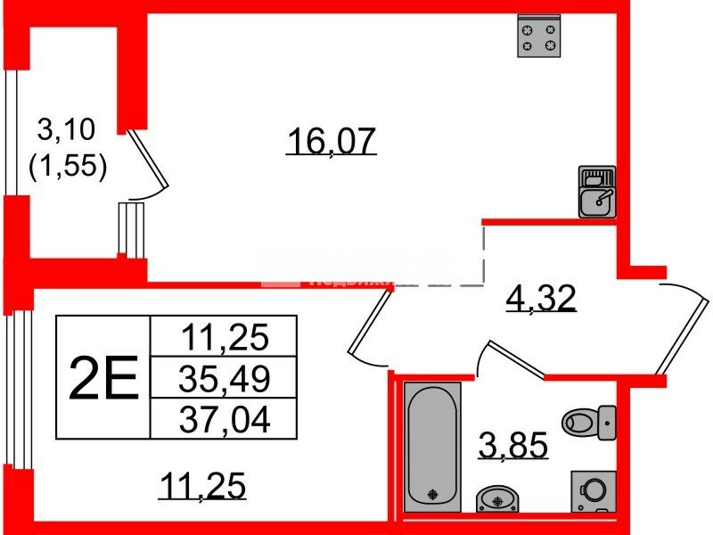Тип жилья: 1-комн. европланировка с просторной кухней-гостиной.