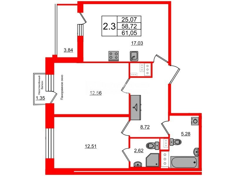 2-комн. кв. 58.72 м² у метро Комендантский Проспект
