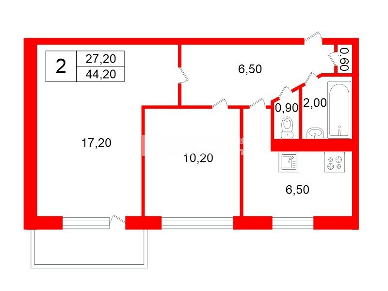 2-комн. кв. 44.2 м² у метро Улица Дыбенко