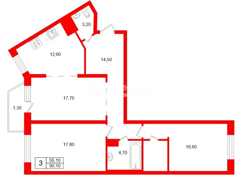 3-комн. кв. 90.1 м² у метро Комендантский Проспект