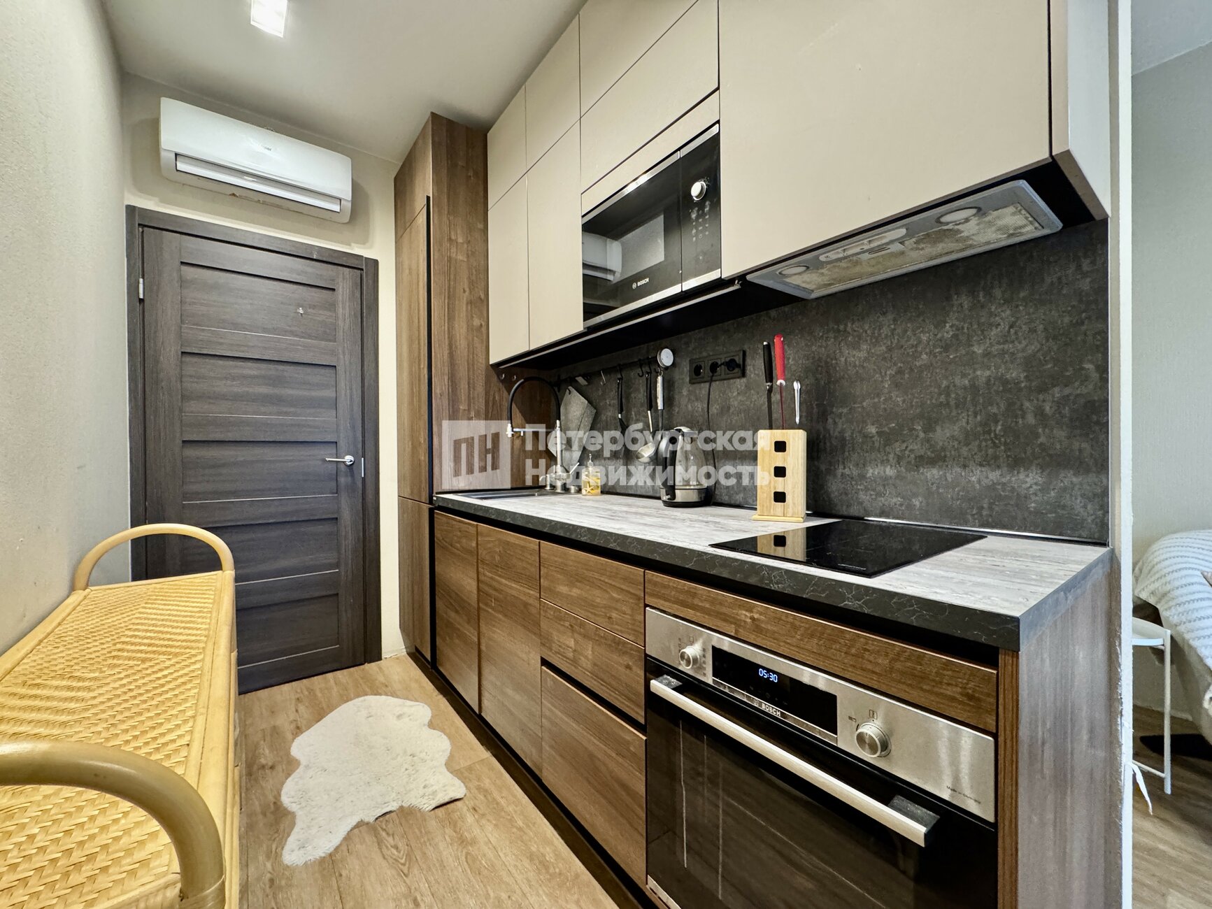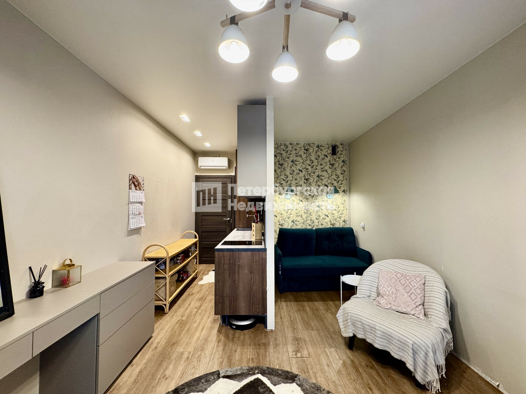 • Всё остается новому владельцу: современная встроенная кухня с техникой, компактный раскладной диван, мебель в прихожей и текстиль.