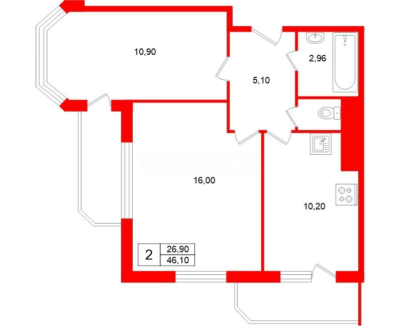 2-комн. кв. 46.1 м² у метро Проспект Просвещения