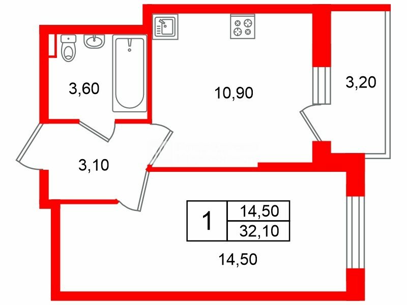 1-комн. кв. 32.1 м² у метро Рыбацкое