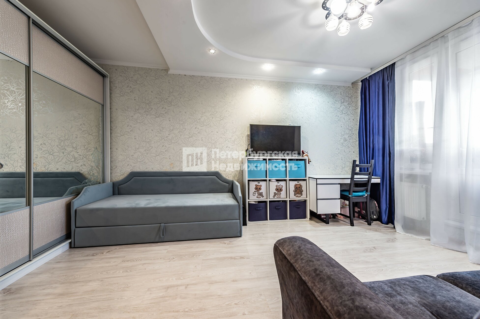 - Светлая комната, в которой с комфортом сделано зонирование: спальное место, место отдыха для всей семьи и небольшое рабочее место.
